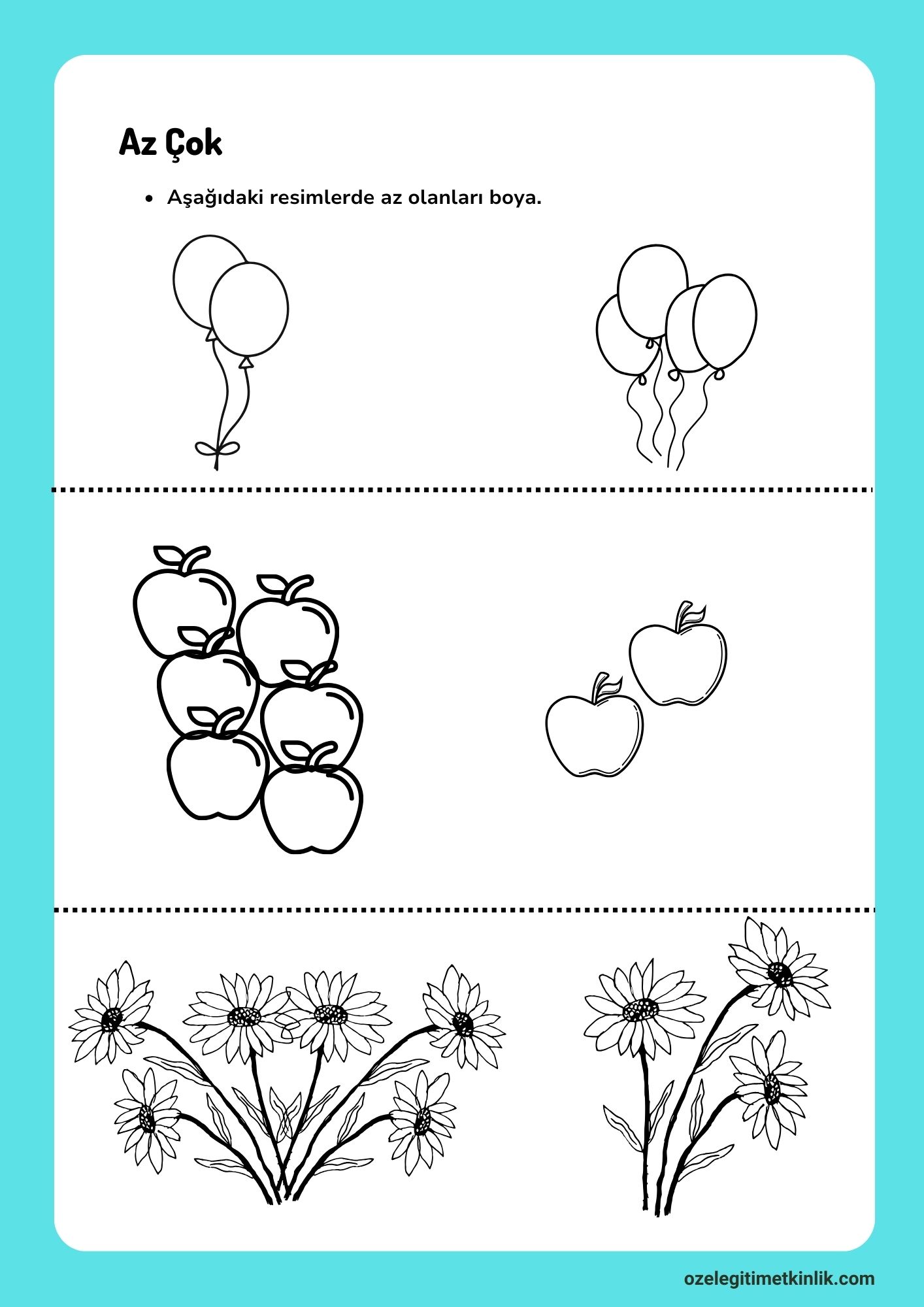 Az çok kavramı çalışma sayfası PDF indir. Okul öncesi ve özel eğitim öğrencileri için hazırlanmış az-çok etkinlikleri, görsel destekli çalışma kağıdı.